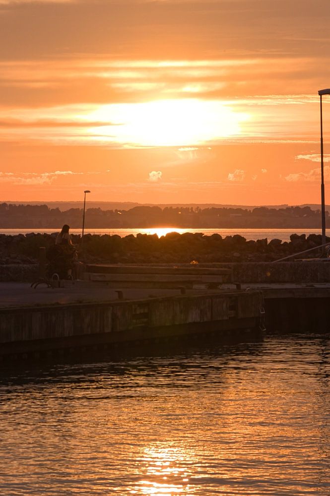Hafen zum Sonnenuntergang am Vaetternsee in Schweden. Romantische Abendstimmung, mit brennenden Himmel in Rot und orange. Aufgenommen in Skandinavien, Schweden.