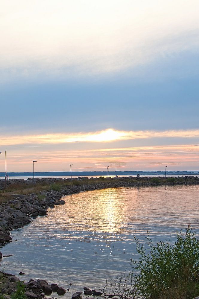 Hafen zum Sonnenuntergang am Vaetternsee in Schweden. Romantische Abendstimmung, mit brennenden Himmel in Rot und orange. Aufgenommen in Skandinavien, Schweden.