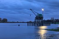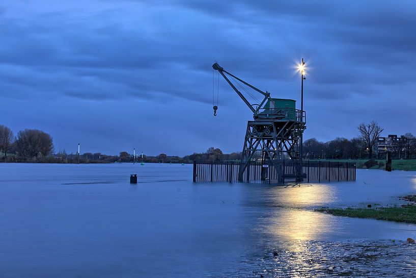 In dieser Abendaufnahme erhält ein Industriekran eine fast monumentale Ausstrahlung. Durch das Hochwasser der Maas steht der Kran teilweise im Wasser, wodurch das Licht der Laterne und die Struktur des Stahls noch stärker auf der glatten Oberfläche reflektiert werden. Die Kombination aus hohem Wasserstand, sanftem Abendlicht und ruhiger…