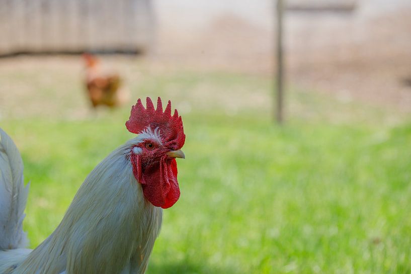 Eine Nahaufnahme eines Hahns auf einer Wiese mit einem anderen Huhn im Hintergrund. Der Hahn hat ein weißes Federkleid und einen leuchtend roten Kamm.