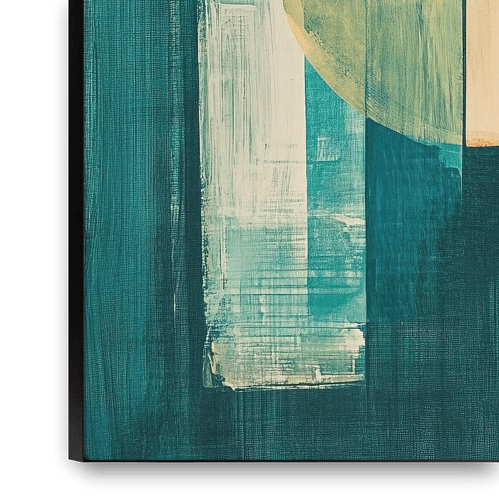 Halbkreis – Dieses abstrakte Gemälde zeigt große geometrische Flächen mit einem hohen vertikalen, strukturierten Balken in tiefen blaugrünen Farbtönen und einer kontrastierenden halbrunden beigen Form mit einem warmen orange-roten Rechteck darüber, ein modernes abstraktes Gemälde mit deutlich sichtbarer Struktur und starken…