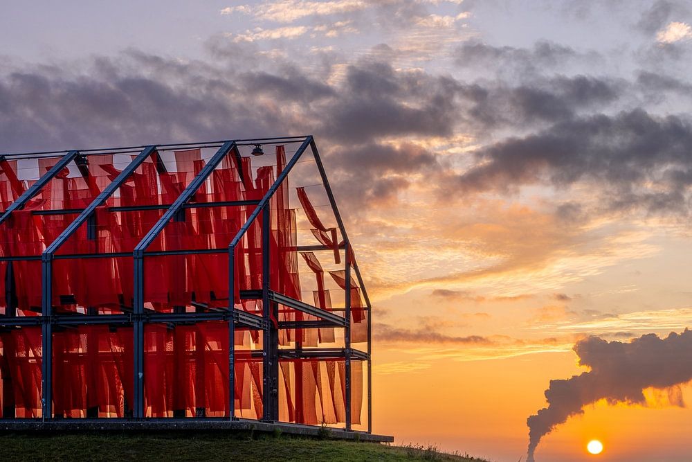 Sonnenaufgang über dem Haldenhaus auf der Halde Norddeutschland, Niederrhein in Nordrhein-Westfalen, Deutschland