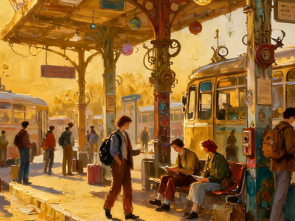 Eine nostalgisch anmutende Busstation wird zur Bühne des urbanen Transits. Reisende mit Koffern, wartende Personen und historische Fahrzeuge verschmelzen in einem goldenen Abendlicht. Die architektonischen Details und schwebenden Elemente verleihen der Szene eine leicht surrealistische Note. Die ausgeprägte Textur der Malerei…
