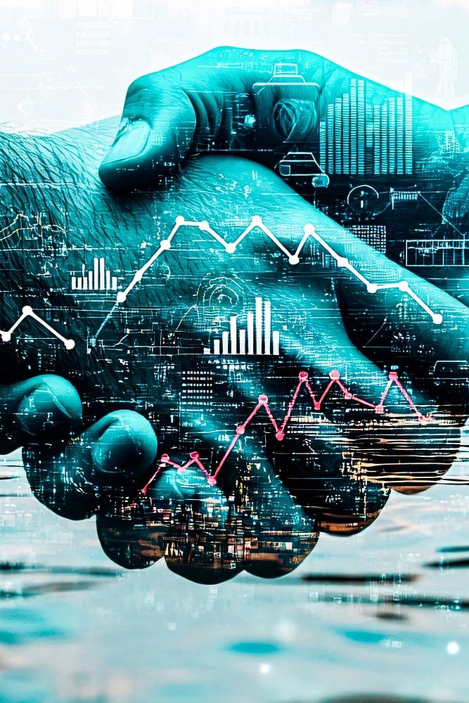 Dieses markante Design kombiniert einen kräftigen Händedruck mit Grafiken wie aufsteigenden Graphen und futuristischer Technologie. Es strahlt ein Gefühl von Zusammenarbeit, Innovation und geschäftlichem Fortschritt aus. Perfekt für moderne Büroräume, verleiht es jeder Umgebung Dynamik und Professionalität. Die kühlen Blau- und Türkistöne haben eine beruhigende und doch energiegeladene Wirkung. Dieses visuell fesselnde Stück inspiriert zu Verbindung und Wachstum. Ein Muss für jeden, der mit moderner Kunst ein Zeichen setzen will.