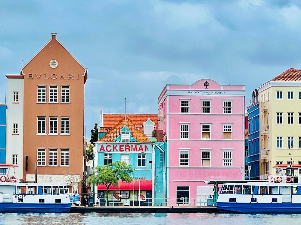 Bunte Häuser und Geschäfte am Kai von WIllemstad Curacao