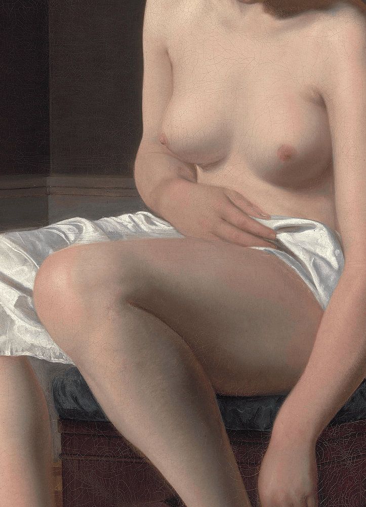 Modell-Studie. Frau Hack sitzt hier als Aktmodell nackt und mit einem Pantoffel bekleidet. Sie ist frontal auf dem Porträt, einem Aktporträt, posiert und lässt ihre Beine, Arme, Brust und Brüste im Bild.
