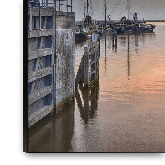 Bestelle das Foto Harbor Salt Camp bei Sonnenuntergang von John Leeninga als Reproduktion auf Leinwand, Alu-Dibond, als Poster, Fototapete oder Acrylglasbild.