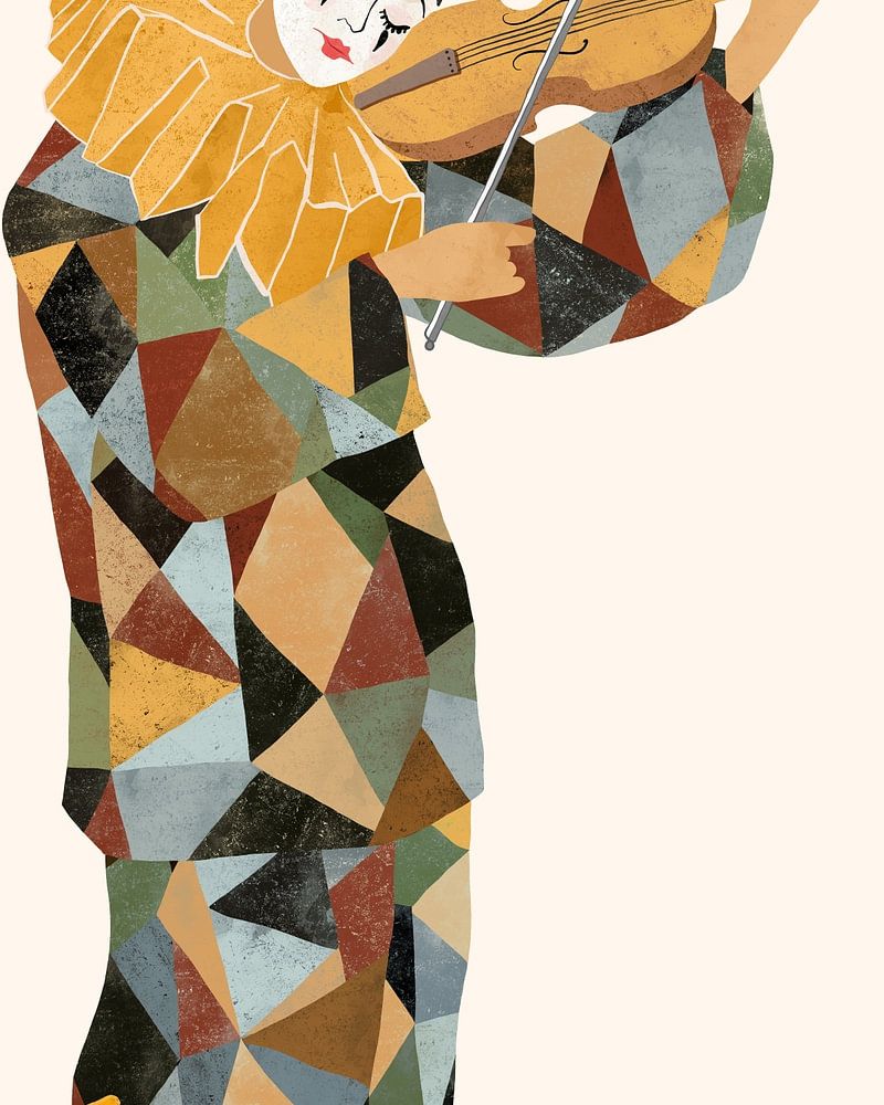 Das Kunstwerk zeigt eine melancholische Szene, in der ein Harlekin Violine spielt. Gekleidet in ein Kostüm, das mit einem Diamantmuster in erdigen Tönen verziert ist, strahlt der Harlekin eine Aura der Traurigkeit und der Nachdenklichkeit aus. Neben dem Harlekin steht eine Vase mit einer verwelkten Blume, die den Zeitverlauf symbolisiert. Im Hintergrund hängt ein ruhiger Mond am Himmel und verstärkt das allgemeine Gefühl der Wehmut und Melancholie.