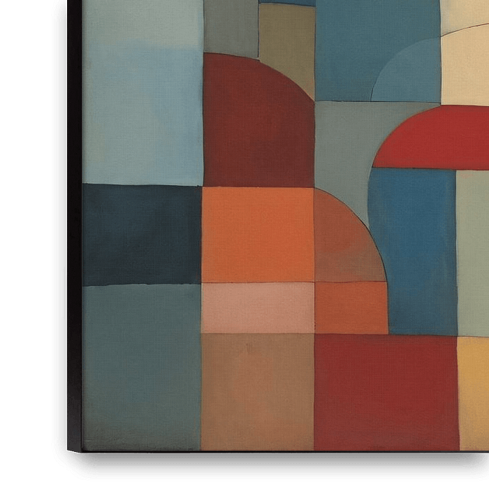 "Harmony in Geometric Shapes" ist ein faszinierendes Gemälde, das sich durch eine ausgewogene Komposition abstrakter Formen und eine harmonische Farbpalette auszeichnet. Die Darstellung besteht aus einer Reihe von geometrischen Blöcken und Kreisen, die zusammen ein beruhigendes Ganzes bilden. Die Variationen in Größe und…