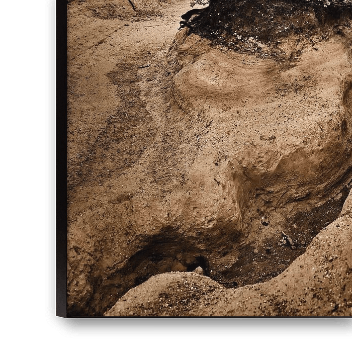 Diese Fotoszene zeigt eine von der Erosion geformte Vulkanlandschaft, in der die ockerfarbene Erde im Kontrast zu der wieder aufkeimenden Vegetation steht, die sich ihren Platz zurückzuerobern versucht. Kleine Büschel grüner Sträucher, die mit leichten Blütenspitzen durchsetzt sind, klammern sich an erhöhte Bodenblöcke, als trotzten sie den von Wasser und Wind gegrabenen Schluchten. Im Hintergrund zeugen die Silhouetten verbrannter Bäume, die geschwärzt und blattlos sind, von Feuer, Schwefel und früheren Durchgängen heißer Gase. Es ist eine Szenerie, in der jede Pflanze einen langen Kampf gegen Säure, Trockenheit und Stürme aus Vulkanstaub zusammenzufassen scheint. Der verschleierte Himmel verstärkt den rohen und mineralischen Charakter dieser Szene und lässt nur die entfernte Präsenz des Kraters des Kawah Ijen erahnen. Dieses Bild ist ein perfektes Beispiel für die fragile Koexistenz zwischen der Härte des Reliefs und der Vitalität der Pflanzenwelt in einer Umgebung, in der der Boden schneller als im Flachland Risse bekommt, sich eingräbt, aufreißt und wieder zusammenwächst. Es ist eine starke Mahnung: Selbst am Rand schwefelhaltiger Krater baut sich das Leben wieder auf, langsam, aber hartnäckig.