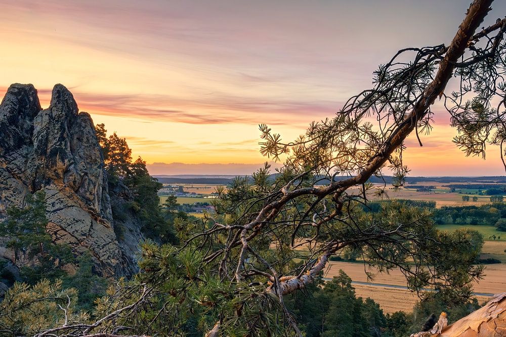 Landschaft im Landkreis Harz in Sachsen-Anhalt mit schön gewachsenem Ast einer alten Kiefer.