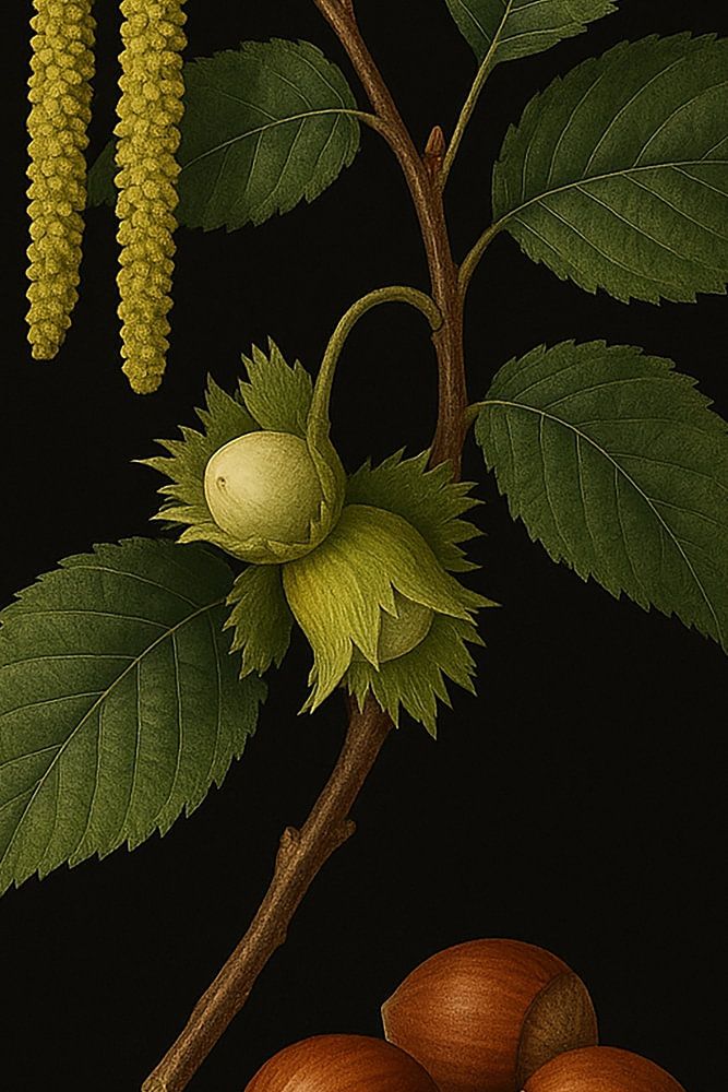 In diesem botanischen Aquarell kommen alle Stadien der Pflanze zusammen: die anmutigen Kätzchen und roten Blüten, die reifenden Früchte in ihrer weichen Schale und die glänzenden reifen Haselnüsse am Fuße des Zweigs.