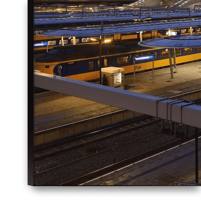 Bestelle das Foto Hauptbahnhof und Rathaus von Utrecht von Donker Utrecht als Reproduktion auf Leinwand, Alu-Dibond, als Poster, Fototapete oder Acrylglasbild.