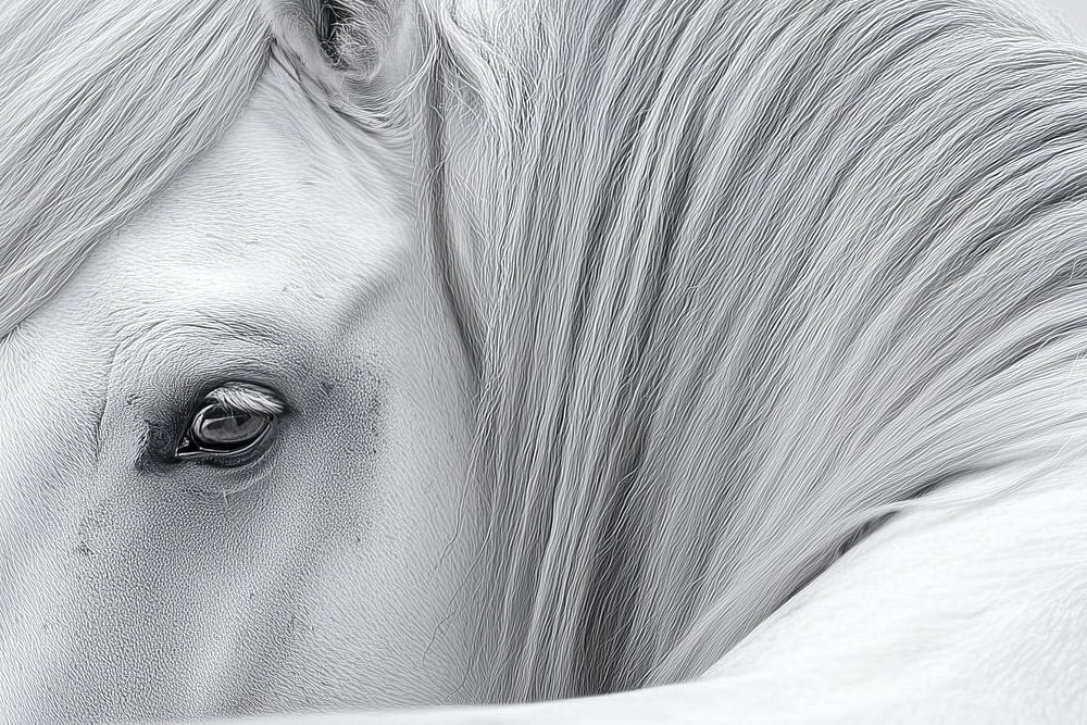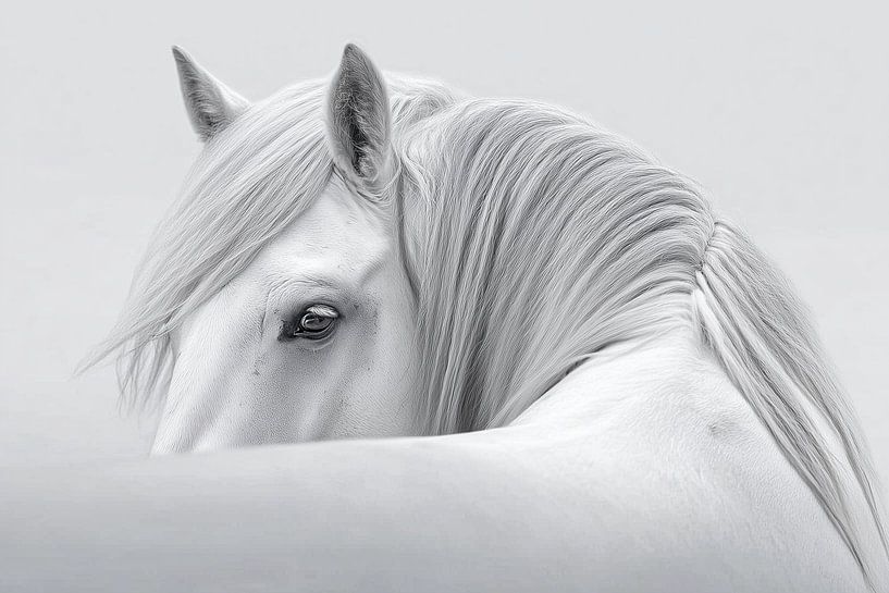 In sanften Grautönen erscheint ein Pferd, das zwischen Anwesenheit und Abwesenheit zu schweben scheint. Der Blick ist nach innen gerichtet, während die Bewegung der Mähne eine stille Energie in das Bild bringt.