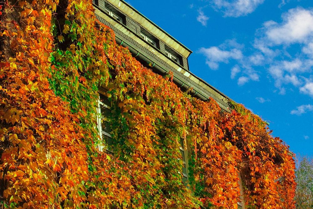 Haus komplett bewachsen mit herbstlichen Efeu oder Wein in Altena (NRW), Deutschland.