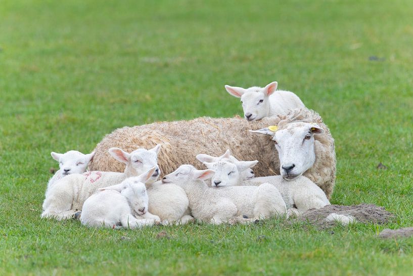 Hausschaf, Ovis orientalis aries, Mutterschaf mit Lämmern, Schleswig-Holstein, Deutschland