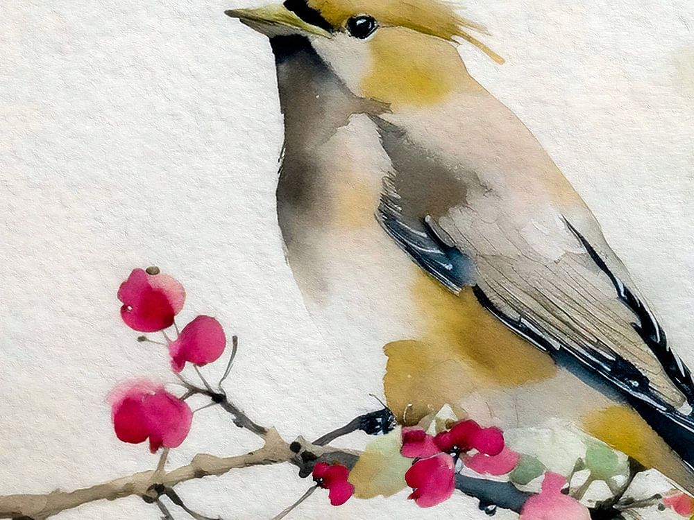 Ruhiges und heiteres Kunstwerk eines japanischen Vogels auf einem Zweig mit Beeren.