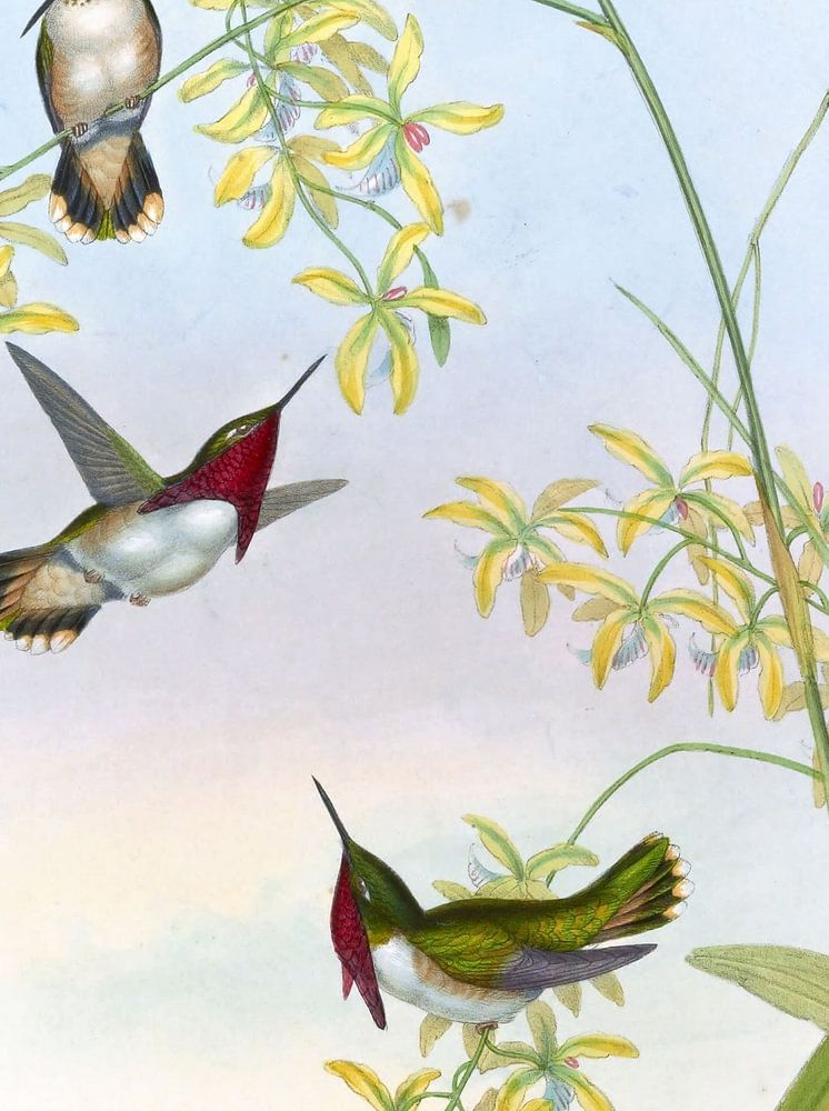Heloisas Flammenträger (Selaphorus heloisæ), John Gould Diese schöne Art ist sowohl in Form als auch Färbung so direkt zwischen den Mitgliedern der Gattungen Calothorax und Selaphorus, dass es äußerst schwierig ist, mit welcher von ihnen sie platziert werden sollte. In seiner Größe und in seinem glitzernden Gorget bietet es eine enge Affinität zu ersteren und in Form seines Schwanzes zum letzteren; Unter diesen Umständen würden einige Naturforscher es zur Art einer neuen Gattung machen, und sollten andere Arten, die ähnliche Charaktere besitzen ein Zeichen des Zweifels darüber, dass es sich um den richtigen Ort handelt. Diese Illustration wurde in ihre ursprüngliche Lebendigkeit wiederhergestellt, indem die Farben verstärkt und unerwünschte Markierungen entfernt werden. Eine Monographie der Trochilidæ oder der Familie von Kolibris wurde zwischen 1849 und 1887 vom englischen Ornithologen John Gould veröffentlicht. Diese monumentale Arbeit zeigt und beschreibt alle bekannten Arten von Kolibris zu dieser Zeit - mit 418 lithografischen Platten und Informationen zu 537 Arten. "