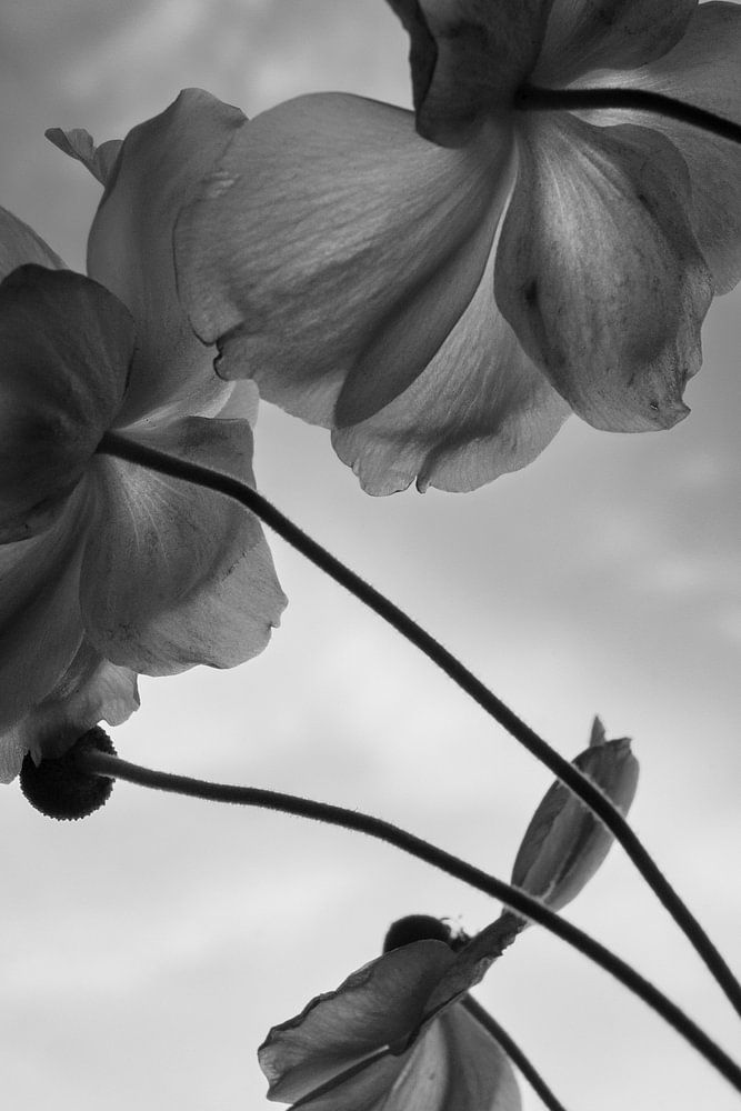 Schöne Nahaufnahme einer Gruppe von japanischen Anemonenblüten. Niedriger Blickwinkel mit Herbsthimmel im Hintergrund. Schwarz-Weiß-Blumenstudie