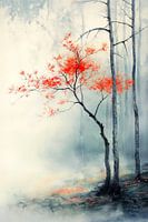 Dieses stimmungsvolle Gemälde fängt jenen einen magischen Moment im Wald ein, in dem die Welt noch schläft und der Nebel zwischen den Baumstämmen tanzt. In einem minimalistischen Stil, der an die raffinierte japanische Tuschemalerei (Sumi-e) erinnert, bildet ein einzelner Baum den strahlenden Mittelpunkt. Während der Hintergrund in…