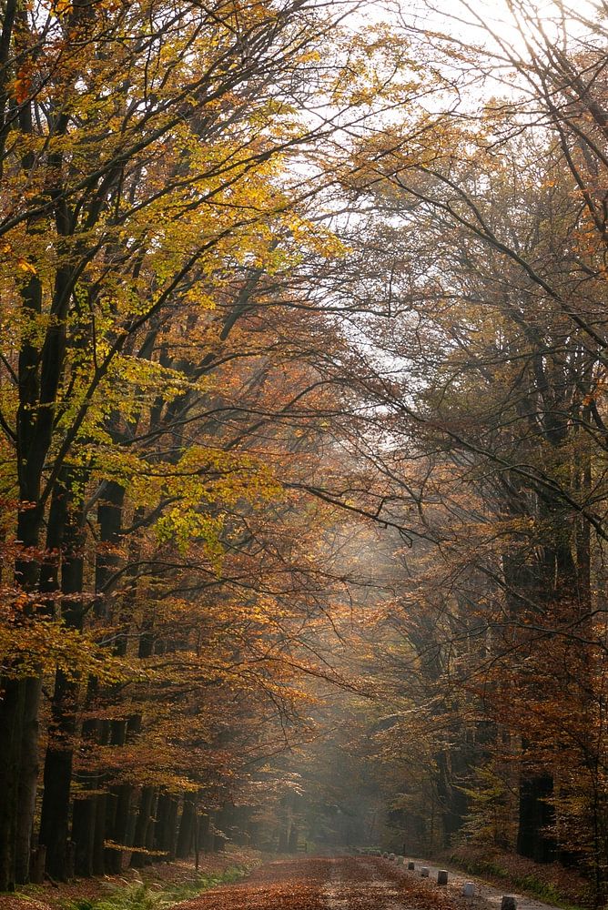 Ein nebliger Morgen in einem wunderschönen Wald. Schöne Rot- und Orangetöne färben die Umgebung. Die Blätter haben ihre Herbstfarben und fallen herunter.