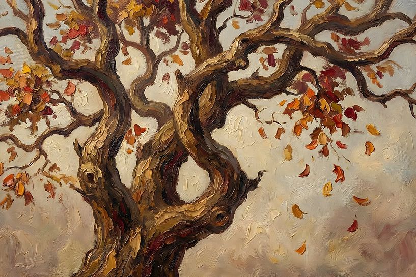 Ein stimmungsvolles Ölgemälde eines einsamen Baumes im Herbst, in dem sich warme Gold-, Orange- und Rottöne langsam lösen und durch die Luft wirbeln. Die fallenden Blätter vermitteln ein Gefühl von Bewegung und Stille zugleich, so als würde die Natur einen Atemzug tun.