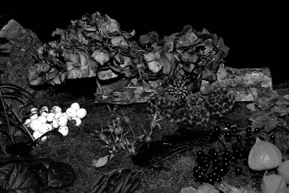 Ein Stilleben mit herbstbezogenen Materialien wie Samenschoten, Beeren und schön gefärbten Blättern in Schwarz-Weiß.