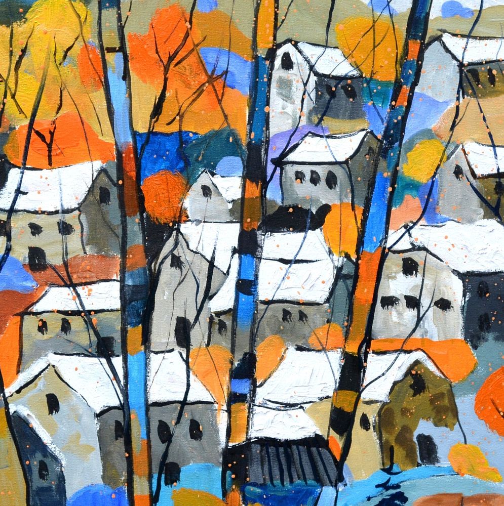 Quiet autumn - Öl auf Leinwand 70 x 70 cm - Dieses Gemälde zeigt eine lebhafte Dorfszene in einer Herbstlandschaft. Die Häuser mit snow-covered roofs sind in einem Wald voller warmer Farben geclustert, vor allem helle Orangen und Gelbweine, die im Kontrast zu den kühlen Blues und Greys stehen. Die schlanken Bäume mit dunklen Stämmen verleihen dem Bild eine ausgeprägte Vertikalität und lenken das Auge natürlich in den Hintergrund. Der Himmel ist ein tiefes Gelb und suggeriert das goldene Licht eines Herbstsonnabends. Der Künstler verwendet starke Linien und Blöcke aus leuchtenden Farben, um eine Szene darzustellen, die sowohl dynamisch als auch friedlich ist. Die Verwendung von Farbe ist so meisterhaft, dass sie eine warme Atmosphäre trotz des Vorhandenseins von Schnee hervorruft. Das Nebeneinander von natürlichen und architektonischen Elementen schafft eine auffallende visuelle Harmonie, die den malerischen Charakter des Dorfes hervorhebt. The reflections in the water in the foreground add an extra dimension, increasing the impression of depth and serenity. Dieses Bild verkörpert eine erfolgreiche Verschmelzung von Abstraktion und Realismus und bietet eine moderne Interpretation der ländlichen Ruhe. Die Komposition spiegelt eine undeniable technische Meisterschaft wider und zeugt von einer künstlerischen Sensibilität, die zu Kontemplation und Flucht einlädt.