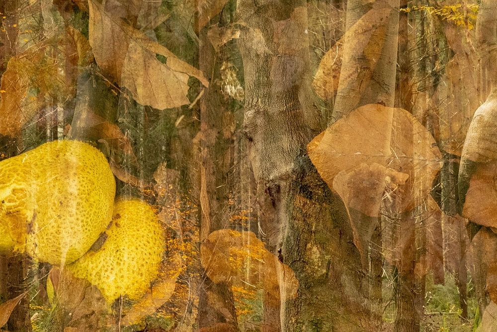Das Foto zeigt ein kreatives Rendering eines Waldes im Herbst mit einem originellen Ansatz, bei dem mehrere Schichten von Blättern verwendet werden. Die Beleuchtung ist ausgewogen und gibt die warmen Töne der Blätter und Bäume wunderschön wieder und schafft eine gemütliche, herbstliche Atmosphäre. Die Wahl einer 100-mm-Brennweite bietet einen intimeren Blick auf den Wald, mit einer weichen Schärfe, die die Details der Rinde und der Blätter hervorhebt. Die Farben sind leuchtend, mit einer schönen Variation von Gelb- und Brauntönen, die das jahreszeitliche Gefühl noch verstärken. Die gleichmäßige Struktur der Blätter auf dem Bild erzeugt einen malerischen Effekt und verleiht der Komposition eine gewisse Originalität.