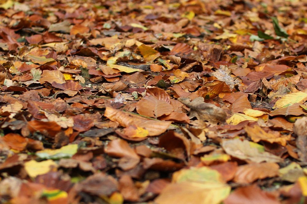 Verlorenes Herbstlaub auf dem Boden im Wald.