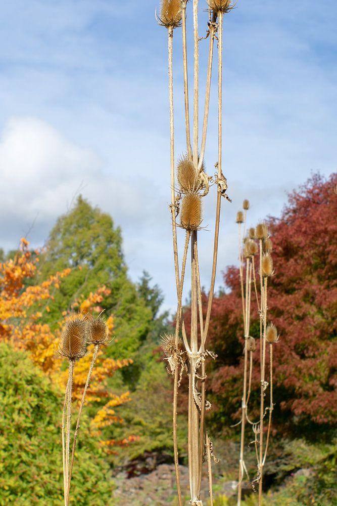 Landschaft mit sehr hohen Disteln. Große Herbstfarben.