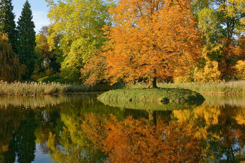 Der Herbst mit seinen prachtvollen Farben hat im Schlosspark Wiesenburg wieder seinen Einzug gehalten. Wiesenburg/Mark, Landkreis Potsdam-Mittelmark, Naturpark Hoher Fläming, Brandenburg, Deutschland. Aufgenommen im Oktober 2019.