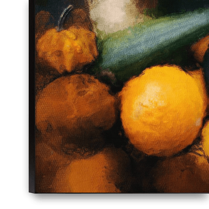 Stillleben mit diversen herbstlichen Feldfrüchten wie Zierkürbissen, Hokkaidokürbis, Zucchini und anderes mehr. Fotografie, die ich digital übermalt und anschließend mit diversen Texturüberlagerungen ediert habe, um einen Ölfarbeffekt zu erzielen.