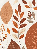 Ein elegantes botanisches Muster mit einer vielfältigen Sammlung von Herbstblättern in einer raffinierten Palette aus Rost, Terrakotta, verbranntem Orange, Karamell und Creme. Das Muster zeigt verschiedene Blattformen und -größen, von breiten ovalen Blättern bis hin zu zarten Fiederformen und kleinen Beerenzweigen, die alle mit…