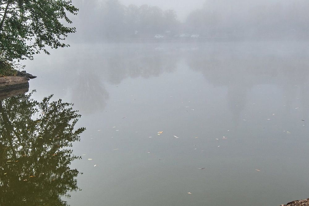 Herbstlicher Nebel am Fluss. Hier an der Mainfähre nach Seligenstadt, Hessen.