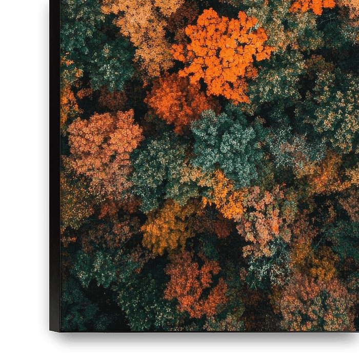 Ein lebendiges Mosaik aus leuchtenden Farben entfaltet sich: warme Orangetöne umrahmen satten Grüntöne, während die kräftige Herbstpalette die Landschaft betont. Diese faszinierende Naturszene lädt dazu ein, die Vielfalt und Schönheit der Jahreszeiten zu feiern, und vermittelt ein Gefühl von Ruhe und Geborgenheit im Herzen der Natur.