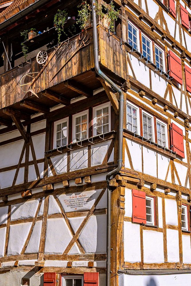 Ein beeindruckendes, hohes Fachwerkhaus mit charakteristischen roten Fensterläden prägt die Szene in Blaubeuren. Seine historische Holzkonstruktion und der überkragende Balkon heben sich strahlend vom weiß verputzten Untergrund ab. Die Herbstfarben der Bäume im Hintergrund und der dramatische Himmel verleihen dem Bild eine malerische Tiefe.
