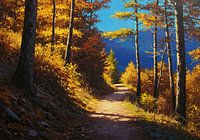 Dieses reich strukturierte Ölgemälde zeigt einen sonnenbeschienenen Pfad, der sich durch einen lebhaften Herbstwald schlängelt. Die Leinwand ist dicht mit pastosen Pinselstrichen versehen, die die goldenen und verbrannten Orangetöne des Herbstlaubs vor einem eindrucksvollen, tiefblauen Himmel einfangen. Das Sonnenlicht dringt durch das…