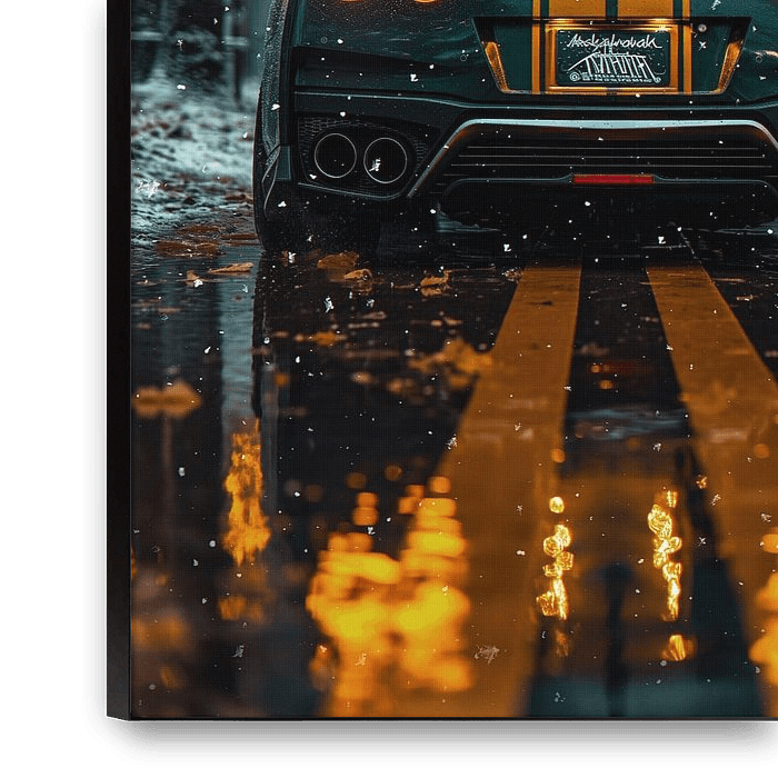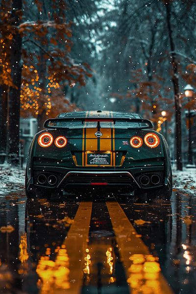 Ein atemberaubender Nissan GT-R R35, aufgenommen in einem verschneiten Herbstwald. Die orangefarbenen Rückleuchten und gelben Rennstreifen bilden einen wunderschönen Kontrast zum kalten, blauen Winternebel. Ein Meisterwerk aus Farbe und Kraft.