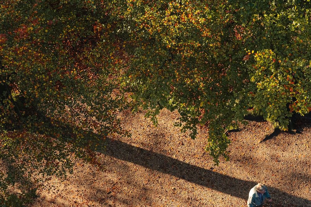 Dieses Foto wurde aus einiger Höhe aufgenommen, so dass die Schatten, die die tiefstehende Sonne wirft, schön zu sehen sind. Ich fand, dass die Schatten der verschiedenen Bäume und des Spaziergängers eine interessante Komposition ergaben.