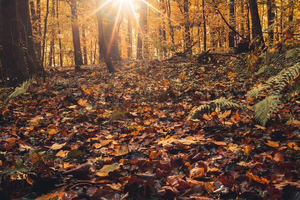 Herbstliches Laub im Habichtswald bei Kassel, bodennahe Perspektive, buntes Laub auf dem Waldboden, ein Sonnenstern im Hintergrund