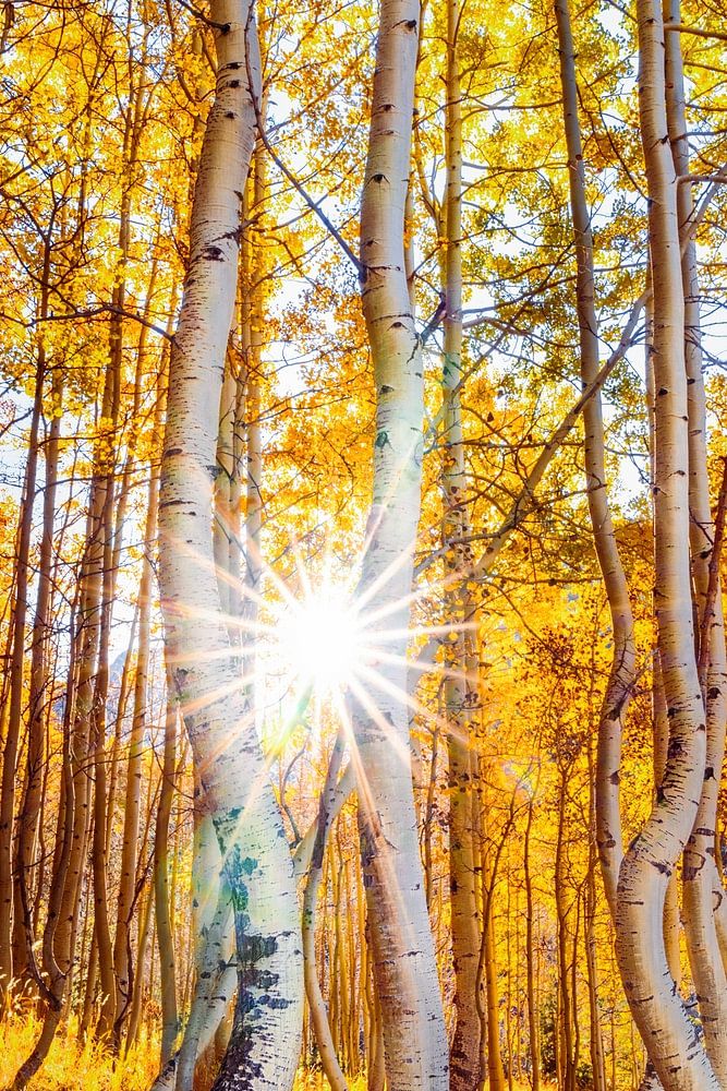 Fine-Art-Fotografie Druck von geschwungenen Espe Bäume mit einem Sonnenaufgang Sonnenaufgang und Herbstfarben. Dieses Foto ist eine große Passform für Metall und Leinwand drucken Wall Art Optionen in Ihrem Haus oder Büro.