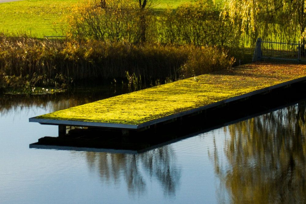 Herbstzauber am Steg inmitten des Bürgerparks der Hansestadt Wismar. Bunte Bäume und ein bemooster Steg, umgeben von tiefblauem Wasser. Was kann schöner sein?