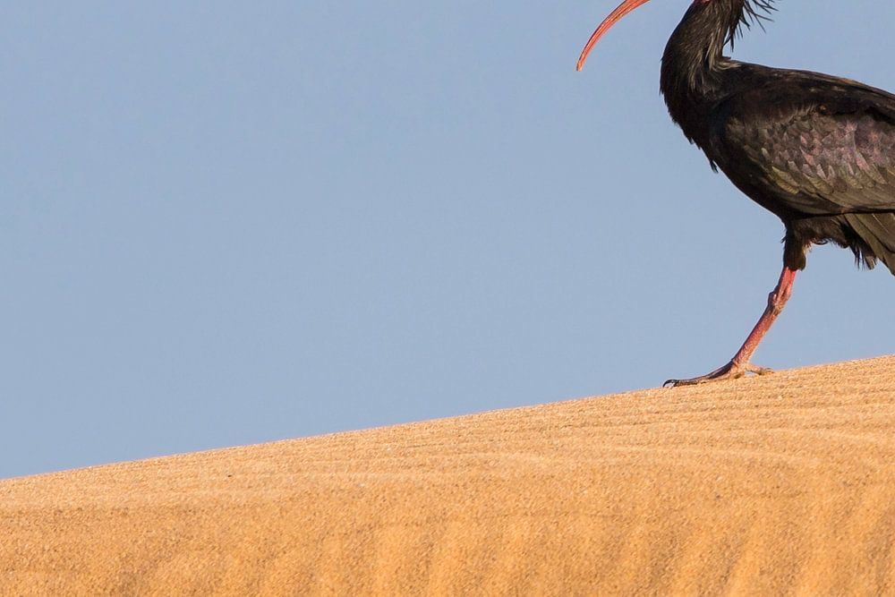 Heremietibis (Geronticus eremita) beim Spaziergang über eine Sanddüne in Marokko, Foto: Dubi Shapiro.
