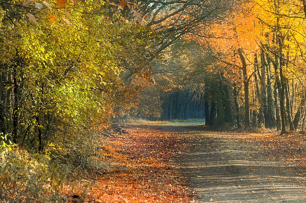 Mooie herfstkleuren, gefotografeerd aan de rand van het bos in Uden. Nog niet alles is bruin, hier en daar zijn nog groene bladeren zichtbaar. Het licht valt mooi gefilterd door het bladerdak en laat de blaadjes oplichten.