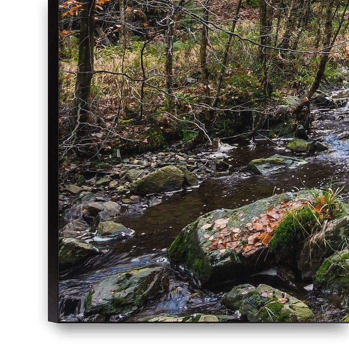 Een pad in de Ardennen in de herfst van 2017. Het pad loopt langs een beekje met vele watervallen. Door het vochtige weer (en de koudere nachten) is het rijk aan mos en andere soorten groen.