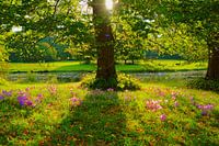 Herfsttijloos en lindeboom op Landgoed Elswout. Roze bloemen op gras en een linde met tegenlicht.