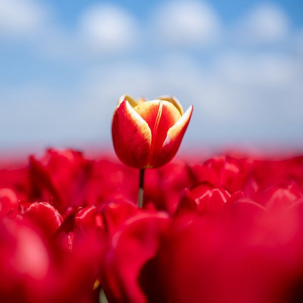In einem Feld voller roter Tulpen ragt ein einzelnes Exemplar deutlich über die anderen hinaus.