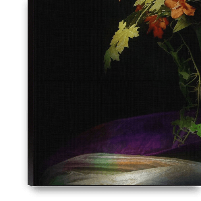 Het boeket bloemen in een vaas, belicht met verschillende kleuren licht waardoor de foto een schilderachtig effect heeft gekregen. Het geheel is geplaatst op organza.
