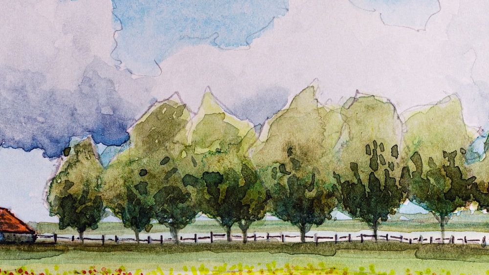Dieses handgemalte Aquarell zeigt eine grüne Wiese, die sich unter einem weiten blauen Himmel erstreckt. Der impressionistische Stil und die verwendete "Strich- und Laviertechnik" schaffen fließende Übergänge zwischen verschiedenen Grün- und Blautönen - von frischen grasgrünen Tönen bis zu einem sommerlichen Wolkenhimmel.